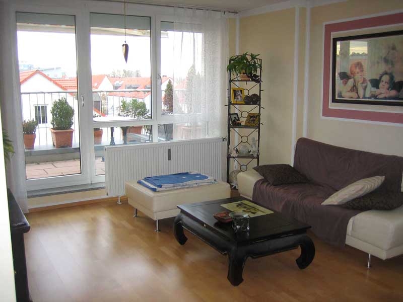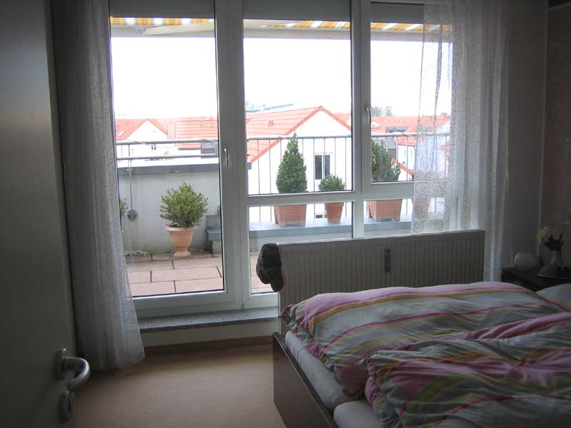 Die helle, schön geschnittene 3-Zimmer-Dachgeschosswohnung befindet sich in einem dreigeschossigen Wohngebäude. Beide großen Schlafräume wie auch das geräumige Wohnzimmer sind zum Innenbereich der Anlage ausgerichtet und haben alle einen direkten Zugang zur großen Dachterrasse mit Südausrichtung. Von hier aus kann man einen herrlichen Blick genießen. Vom Wohn-/Esszimmerbereich gelangt man direkt in die Küche und einen extra Abstellraum. Küche und Abstellraum, ebenso wie das Bad und das Gäste-WC haben jeweils ein Fenster, was alle Räume sehr hell und freundlich macht. Da es sich bei der Wohnung um eine Eckwohnung handelt, gibt es auch im Essbereich noch ein zusätzliches, großes Fenster.