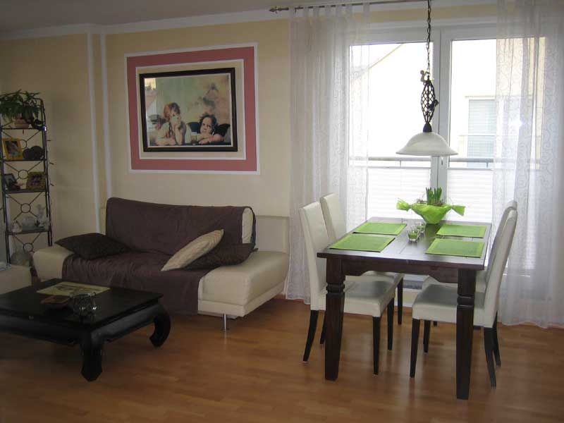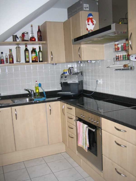 Im Wohn- und Essbereich ist hochwertiger Parkettboden verlegt. Die Küche ist mit einer modernen Einbauküche versehen. Zur Ausstattung gehören ein Herd mit Cerankochfeld, Ofen, Geschirrspülmaschine, Abzugshaube, große Kühl-/Gefrierkombination, eine Waschmaschine mit integriertem Trockner und eine Mikrowelle. Bei allen Geräten handelt es sich um Markengeräte. Im Abstellraum befindet sich ein Regal wie auch ein zusätzlicher Kühlschrank. Die Böden sind mit schönen Fliesen ausgelegt. Beide Schlafräume haben Teppichboden. Der Eingangsbereich, wie auch das Bad und Gäste-WC sind mit sehr geschmackvollen Fliesen versehen. Das Bad verfügt über eine Badewanne und zusätzlich über eine Duschkabine. Auf der großen Dachterrasse ist neben einer großen, elektrischen Markise an einem Ende auch ein farblich abgestimmer Pavillon angebracht. Die Fenster im Wohnzimmer wie auch in den Schlafräumen verfügen über elektrische Rolläden.