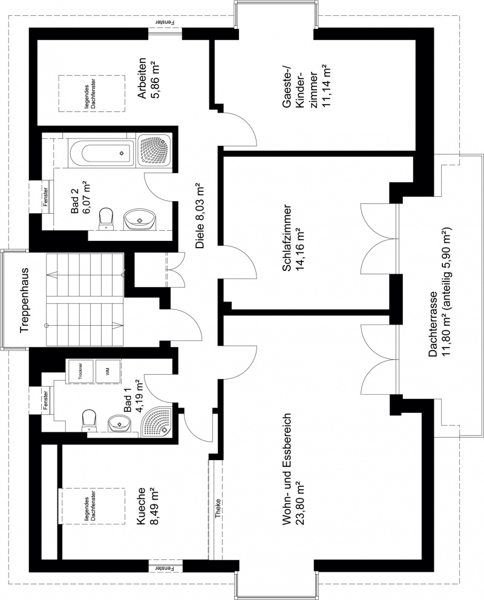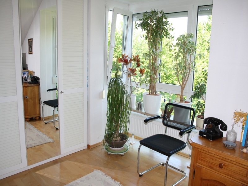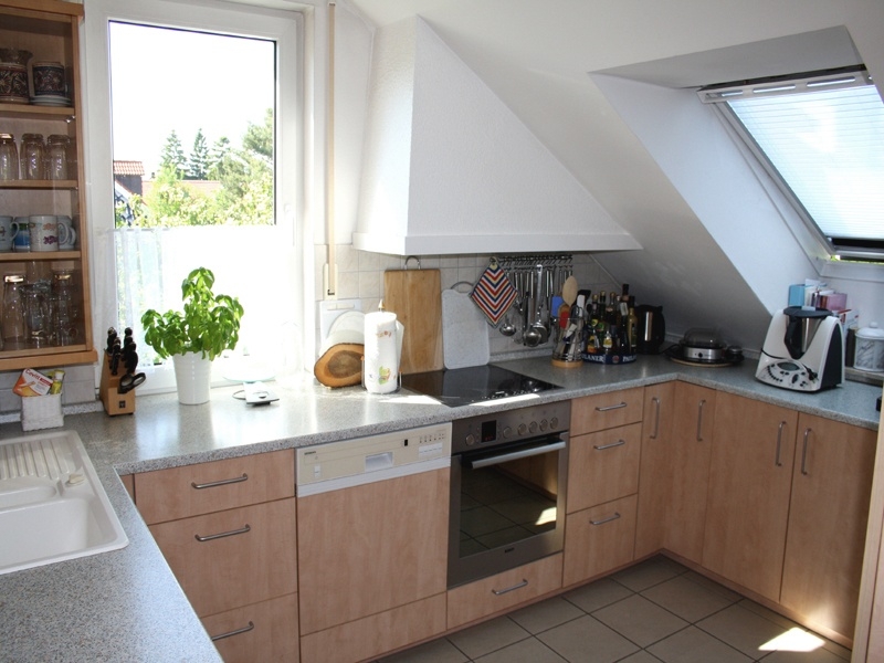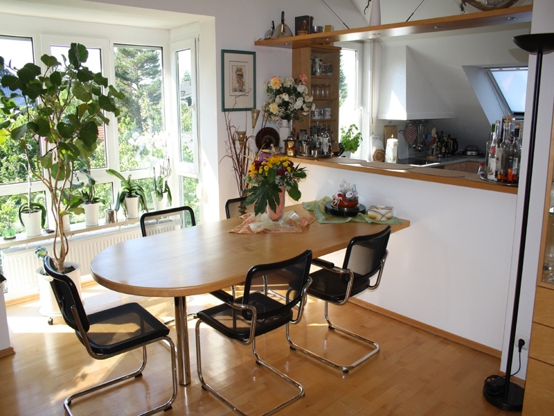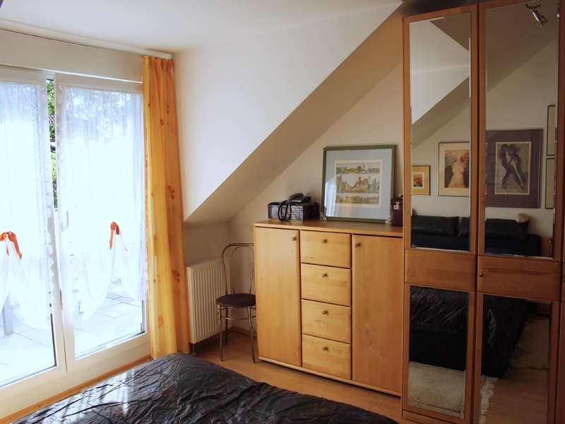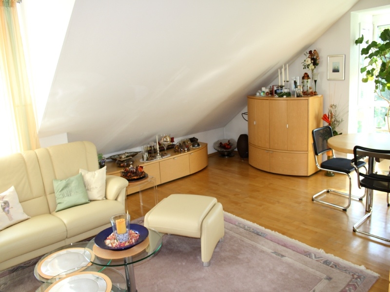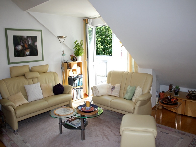 Der großzügige, helle Wohn-/Essbereich bietet trotz der Schrägen genügend Stellflächen. Auch das Schlafzimmer bietet trotz der Schrägen viel Platz zum Stellen der Möbel. Die schöne Dachterrasse ist vom Wohnzimmer und vom Schlafzimmer aus begehbar.