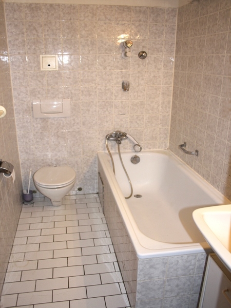 Das Badezimmer wurde hell und freundlich gefliest und verfügt über eine Badewanne.