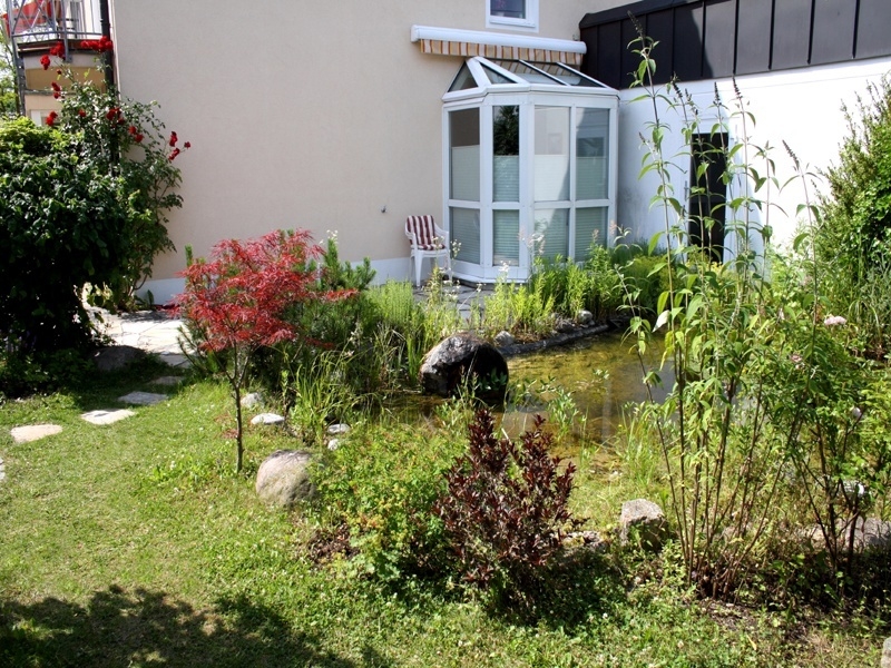Die gemütliche Terrasse in Süd- und Ost-Lage mit Blick in den traumhaft angelegten Garten lädt zum Verweilen ein. Der Garten mit seinem idyllischen Teich wurde durch einen Landschaftsarchitekten geplant. Sogar die Einzelgarage fügt sich harmonisch in das Gesamtbild ein.