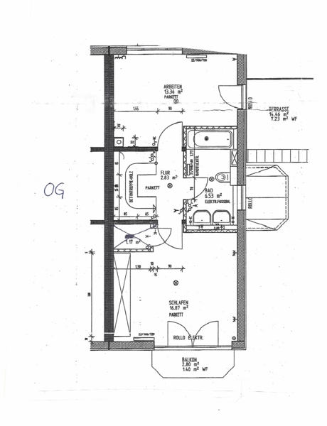 Über eine gut begehbare Holztreppe gelangen Sie in das Obergeschoss. Hier befinden sich ein großes Schlafzimmer mit Südbalkon und ein Kinderzimmer mit Dachterrasse auf der Garage. Das Badezimmer (mit Fenster) hat eine Wanne und wurde zusätzlich mit einer Fußbodenheizung ausgestattet.