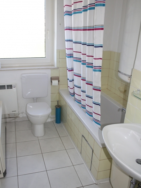 Das Badezimmer wurde mit einer Badewanne ausgestattet und hat ebenso wie das Gäste-WC ein Fenster.