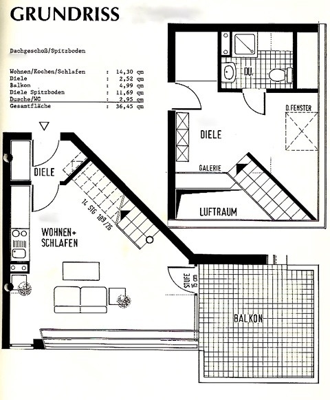 Über eine Treppe gelangt man zum Spitzboden mit Galerie. Dieser Bereich kann zum Schlafen genutzt werden. Hier befindet sich auch das Duschbad mit WC.
