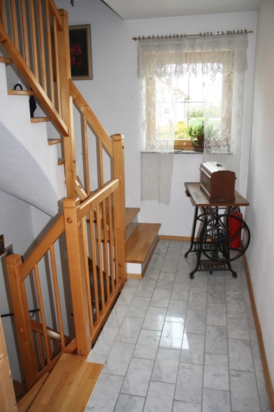 Eine schöne und gepflegte Treppe mit massiven Holzstufen aus Buche führt Sie ins Obergeschoss. Der Flur am Treppenaufgang wirkt mit seinem schönen Marmorboden besonders edel.