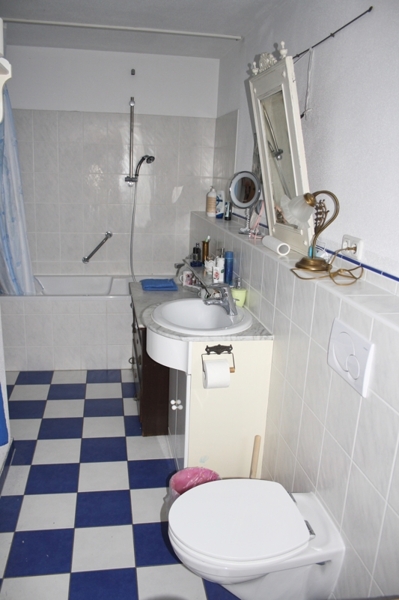 Im voll ausgebauten Dachgeschoss befinden sich ein geräumiges Studio (ca. 24 m² echte Wohnfläche) mit Küchenanschlüssen, ein Gästezimmer und ein schönes Wannenbad, ebenso wie das Bad im Obergeschoss mit Fenster und mit Waschmaschinenanschluss. Das Bad im Dachgeschoss hat hübsche beige Wandfliesen, eine terrakottafarbene Bordüre und dazu passende Bodenfliesen. Im Studio und im Flur wurde das schöne Echtholz-Parkett verlegt; das Gästezimmer bekam einen optisch ebenso sehr ansprechenden dunklen Laminatboden.