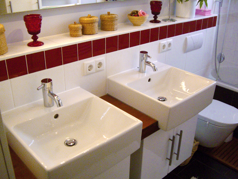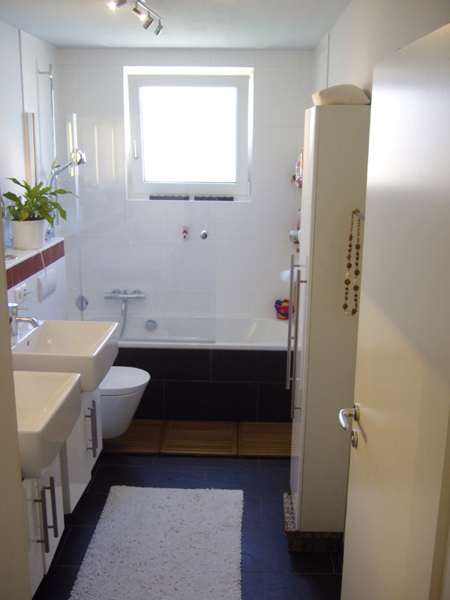 Dem großzügigen Wohnbereich schließen sich die weiteren 4 Zimmer an. Das geräumige Badezimmer ist wiederum etwas Besonderes. Es hat 2 getrennte Waschbecken, eine Duschwanne mit hochwertiger Glasabtrennung, anthrazitfarbene Steinfliesen und einen belüfteten Waschmaschinen- und Trocknerschrank. Die roten Fliesenborde bilden einen tollen Kontrast zu den weißen Wandfliesen. Sowohl das schicke Badezimmer als auch das hübsche Gäste-WC haben ein Fenster.