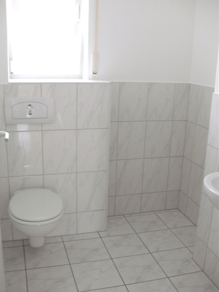 Das deckenhoch geflieste, moderne Badezimmer hat ebenso wie das Gäste-WC ein Fenster. Es verfügt über eine Badewanne sowie einen schönen Spiegelschrank und hat einen Waschmaschinenanschluss. Im geräumigen Gäste-WC ist genug Platz für einen Schrank zur Unterbringung von Badutensilien.
