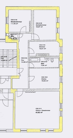 Alle Wohnräume, die geräumige Küche (über 15 m²!) und der großzügige Flur wurden mit edlem Eichenparkett ausgestattet. Das Wohn-/ Esszimmer bietet mit seinen gut 40 m² viel Platz und ist durch die vielen Fenster besonders hell. Neben dem ebenfalls geräumigen Schlafzimmer stehen noch zwei Kinder-/ Arbeitszimmer zur Verfügung.