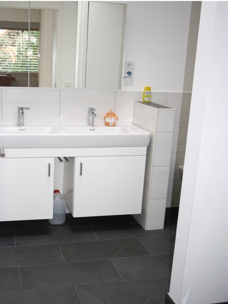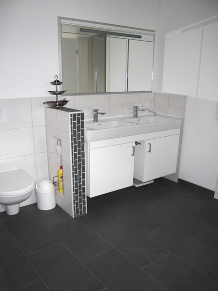 Die Wohnräume im EG und OG wurden mit einem edlen Parkettboden (Eiche weiß geölt) ausgestattet. In der Küche, im Flur und in den Sanitärräumen in EG und OG sind exklusive Fliesen aus Feinstein in Schieferoptik verlegt.