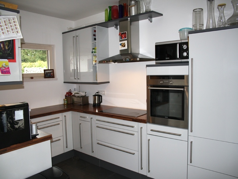Die schicke Marken-Einbauküche bietet viel Stauraum und reichlich Arbeitsfläche. Der hochwertige Induktionsherd hat 4 Platten und zusätzlich eine Warmhalteplatte. Außerdem stehen ein Backofen in Griffhöhe, eine Kühl- Gefrierkombination, eine Spülmaschine, ein Eckschrank mit Rondell zur besseren Platzausnutzung, ein Gewürzschrank, ein Handtuchschrank und Flaschenregale zur Verfügung. Im Flur bietet ein großer Einbauschrank viel Platz zur Unterbringung der Garderobe und von Haushaltsutensilien.