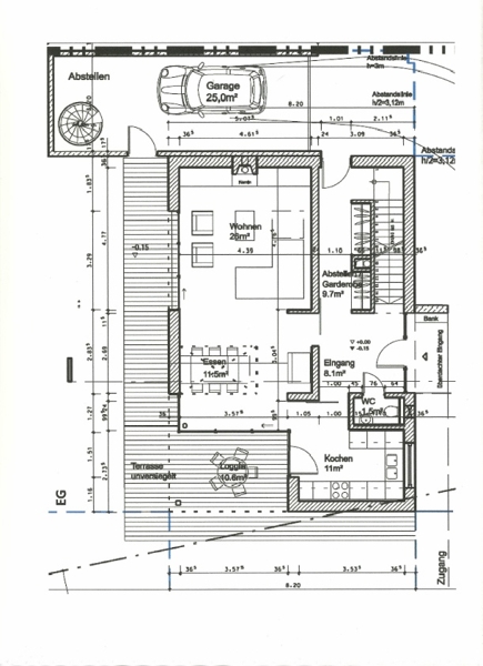 In die Wohnfläche fließt die Hälfte der überdachten Terrasse und lediglich ein Viertel der übrigen Terrassenfläche ein. Der Hobbyraum wurde nur zur Hälfte in der Wohnflächenberechnung berücksichtigt.