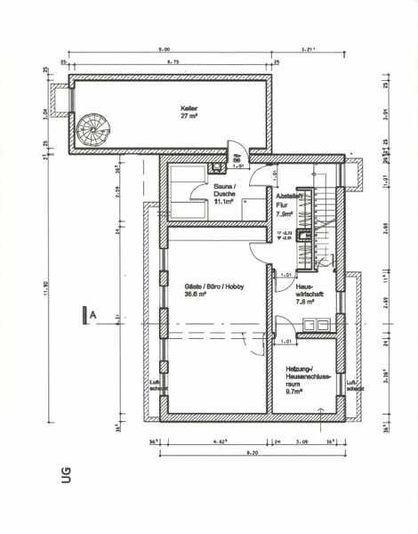 Die Kellertreppe ist gefliest. Im sehr großen, voll ausgebauten Hobbyraum im UG wurde helles Laminat verlegt. Der gesamte übrige Keller ist mit terrakottafarben melierten Fliesen ausgestattet. Eine Sauna (finnische Sauna und Sole-Sauna) bietet die Möglichkeit zur Entspannung. Auch hier im UG steht eine Dusche mit Waschbecken und Spiegelschrank zur Verfügung.