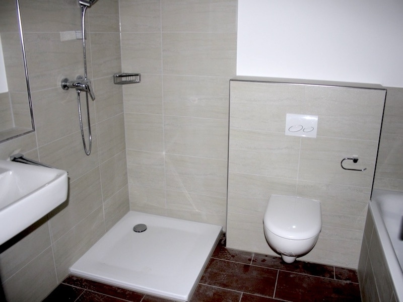 Das Badezimmer im Souterrain (mit Badewanne und Dusche!) wurde mit einem Waschtischunterbau und einem Hochschrank (hängend) ausgestattet.