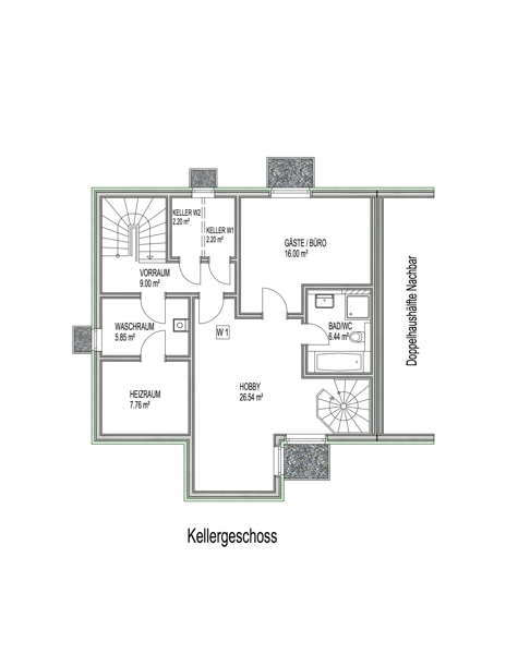 Hier befinden sich ein großer Hobbyraum (über 18 m²) sowie ein Gästezimmer/ Büro (16 m²) mit separatem Eingang.