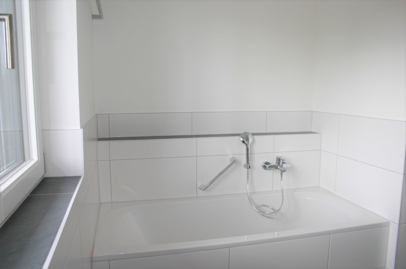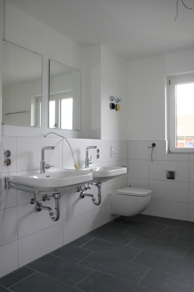 Alle Wohnräume werden mit edlem Parkett in Eiche massiv, geölt ausgestattet. In der Küche und im Bad werden großformatige Bodenfliesen (Feinsteinzeug) verlegt. Diese sind in anthrazit gehalten und bringen im Bad einen tollen Kontrast zu den weißen Wandfliesen und Sanitärobjekten. Das moderne, luxuriöse Badezimmer ist mit 8,54 m² großzügig und selbstverständlich tageshell. Es ist mit Doppelwaschbecken sowie Badewanne und großer, bodenebener Dusche ausgestattet. Auch ein Waschmaschinenanschluss ist vorhanden der alternativ zur Aufstellmöglichkeit im Waschkeller genutzt werden kann. Natürlich gibt es auch ein separates Gäste-WC.