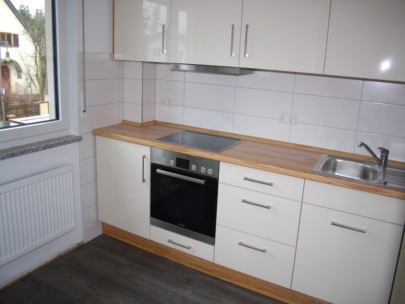 Ebenfalls im OG befindet sich die Küche (mit Fenster) mit Speisekammer. Sie hat eine moderne Einbauküche mit Herd, Cerankochfeld, Geschirrspüler und Kühl-/Gefrierschrank.