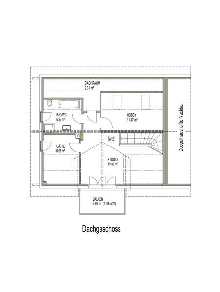 Alle Decken im DG bestechen durch die sichtbaren Balken des Dachstuhls. Hierdurch hat das Studio (über 19 m², mit Zugang zum zweiten Balkon) ein ganz besonderes Flair. Die beiden Dachfenster im Hobbyraum (ca. 11 m²) sind elektrisch gesteuert.
