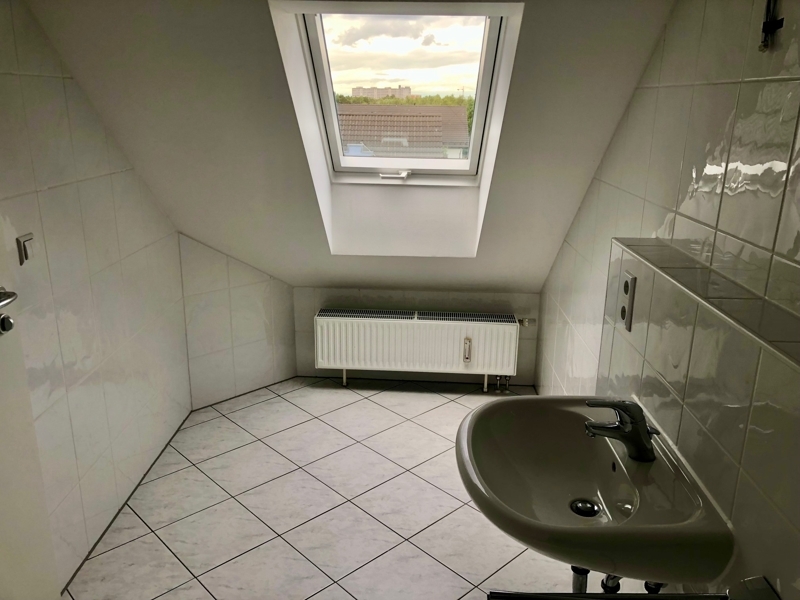 Das Badezimmer verfügt über eine Badewanne, einen Handtuchheizkörper sowie einen schönen Spiegelschrank und einen Waschtischunterschrank. In diesem Bad im 1. DG befindet sich außerdem ein Waschmaschinenanschluss; auch ein Turm (Waschmaschine und Trockner) ist stellbar.