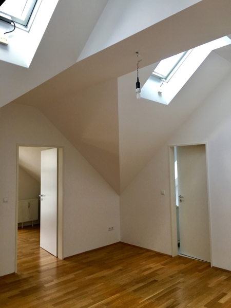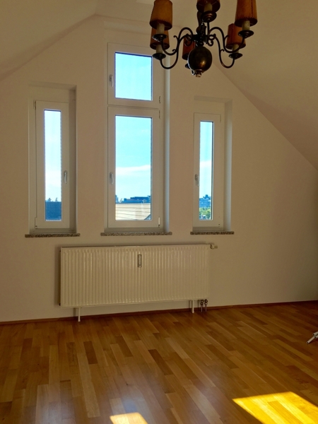 Trotz einiger Schrägen, die die Wohnung besonders stylisch wirken lassen, stehen genügend Wände mit voller Stehhöhe zur Verfügung, so dass sich für die Möbel sehr gute Stellmöglichkeiten ergeben. Der individuelle Eindruck wird verstärkt durch die ganz besondere Gestaltung der Fenster.