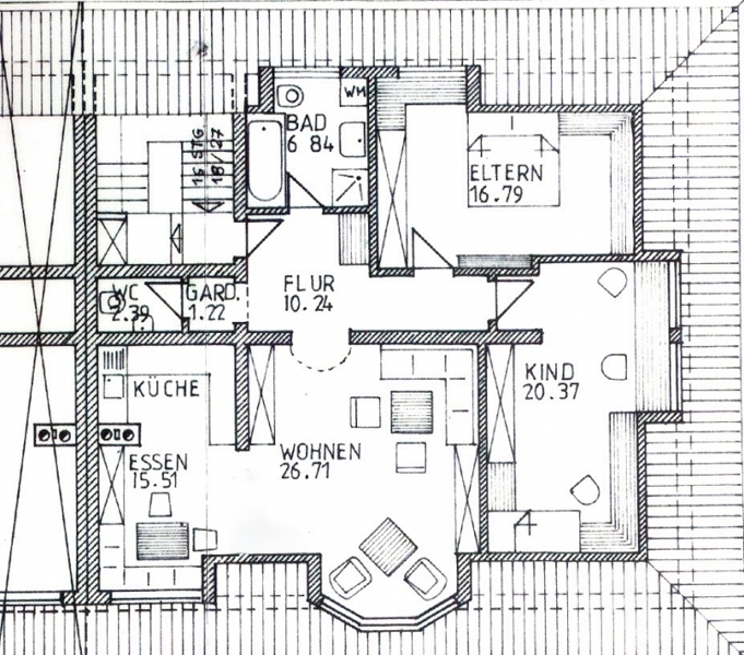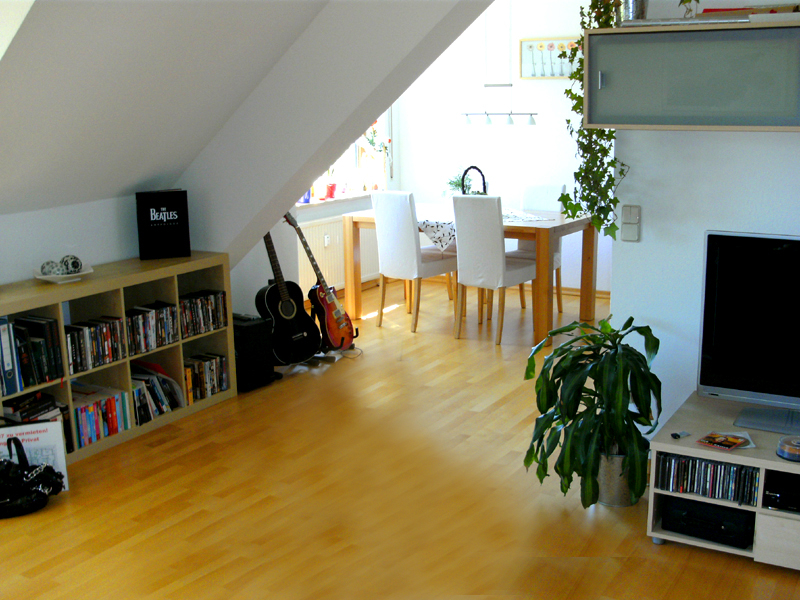 Es handelt sich um eine besonders großzügige 3-Zimmer-Dachgeschosswohnung (über 100 m² reine Wohnfläche!) mit sehr hohem Freizeitwert, denn der gepflegte Garten (vorderer Teil auf den Fotos) steht dem neuen Mieter zur Mitbenutzung zur Verfügung. Die Wohnung liegt im 2. und zugleich obersten OG. Trotz einiger Schrägen, die die Wohnung besonders gemütlich wirken lassen, stehen genügend Wände mit voller Stehhöhe zur Verfügung, so dass sich für die Möbel sehr gute Stellmöglichkeiten ergeben.