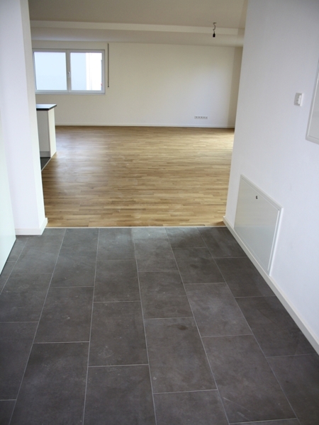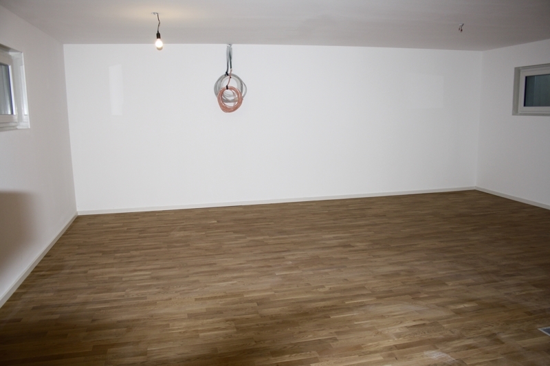 Der Hobbyraum hat wie die Wohnräume im EG eine Fußbodenheizung. Er wurde ebenfalls mit edlem Eichenparkett ausgestattet; im Bereich von Waschmaschine und Trockner wurde der Boden modern gefliest.