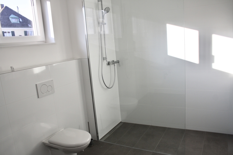 Die Diele und das schicke Badezimmer sind modern gefliest. Das Bad (mit Fenster!) hat zwei Waschbecken und wurde mit einer geräumigen, bodenebenen Dusche mit Glastrennwand ausgestattet.