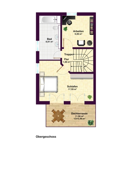 Hier befinden sich das schöne Schlafzimmer (über 17 m²) und ein helles Arbeitszimmer sowie das modern geflieste Bad.