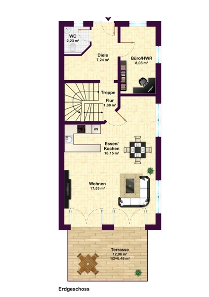 Die Diele und das Gäste-WC (mit Fenster!) im EG sind modern gefliest. Im EG befindet sich außerdem noch ein kleines Büro - sehr praktisch für Homeoffice.