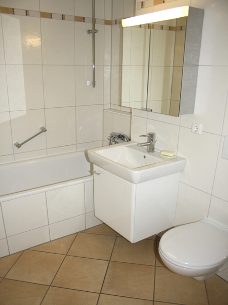 Das Badezimmer lässt ebenfalls keine Wünsche offen. Es wurde hell und freundlich gefliest und verfügt über eine Badewanne und einen Handtuchheizkörper. Zusätzlich wurde es mit einem hochwertigem Spiegelschrank und einem Waschtisch-Unterschrank ausgestattet. Anschlüsse für Waschmaschine und Trockner sind im Bad vorhanden.