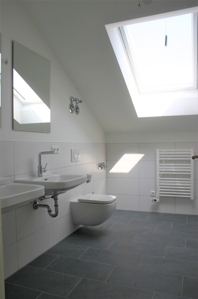 Alle Wohnräume sind mit edlem Parkett in Eiche massiv, geölt ausgestattet. Die moderne Einbauküche ist mit Markengeräten (u.a. Induktionskochfeld) bestückt. In Küche und im Bad wurden großformatige Bodenfliesen (Feinsteinzeug) verlegt. Diese sind in anthrazit gehalten und bringen im Bad einen tollen Kontrast zu den weißen Wandfliesen und Sanitärobjekten. Das moderne, luxuriöse Badezimmer hat ein Dachflächenfenster und ist dadurch schön hell. Es ist mit Doppelwaschbecken sowie Badewanne und großer, bodenebener Dusche ausgestattet. Auch ein Waschmaschinenanschluss ist vorhanden der alternativ zur Aufstellmöglichkeit im Waschkeller genutzt werden kann.