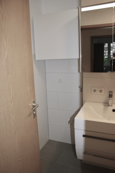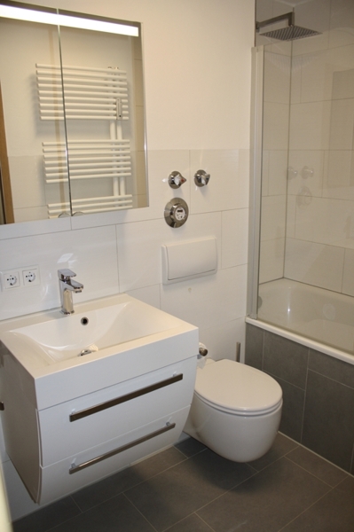 Das schicke Badezimmer wurde vor 3 Jahren komplett erneuert. Es hat einen Waschmaschinenanschluss, eine Badewanne (mit Rainshower-Dusche) und einen Handtuchheizkörper. Das Bad wurde außerdem mit einem hochwertigen Spiegelschrank und einem modernen Waschbeckenunterschrank ausgestattet.