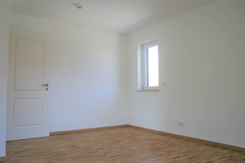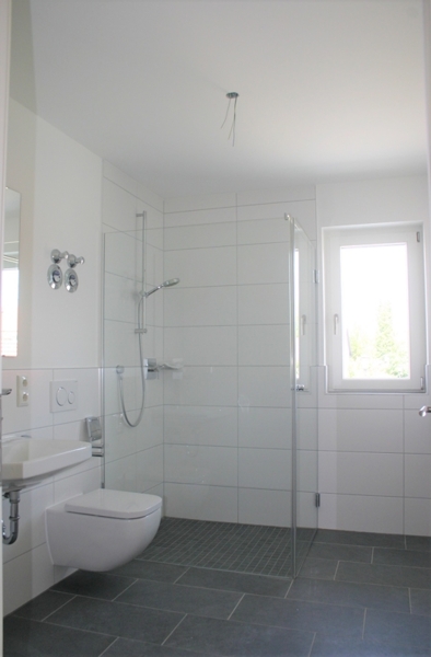 Alle Wohnräume sind mit edlem Parkett in Eiche massiv, geölt ausgestattet. In der Küche und im Bad wurden großformatige Bodenfliesen (Feinsteinzeug) verlegt. Diese sind in anthrazit gehalten und bringen im Bad einen tollen Kontrast zu den weißen Wandfliesen und Sanitärobjekten. Das moderne Badezimmer ist dank Fenster tageshell und verfügt über eine übergroße, bodenebene Dusche. Weitere Annehmlichkeit ist das separate Gäste-WC.