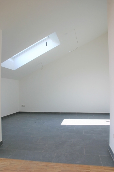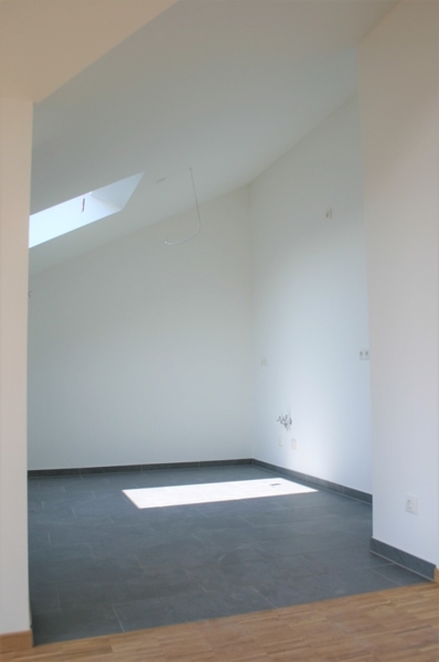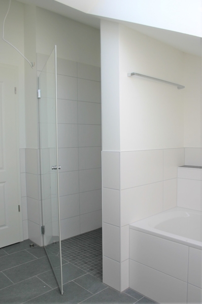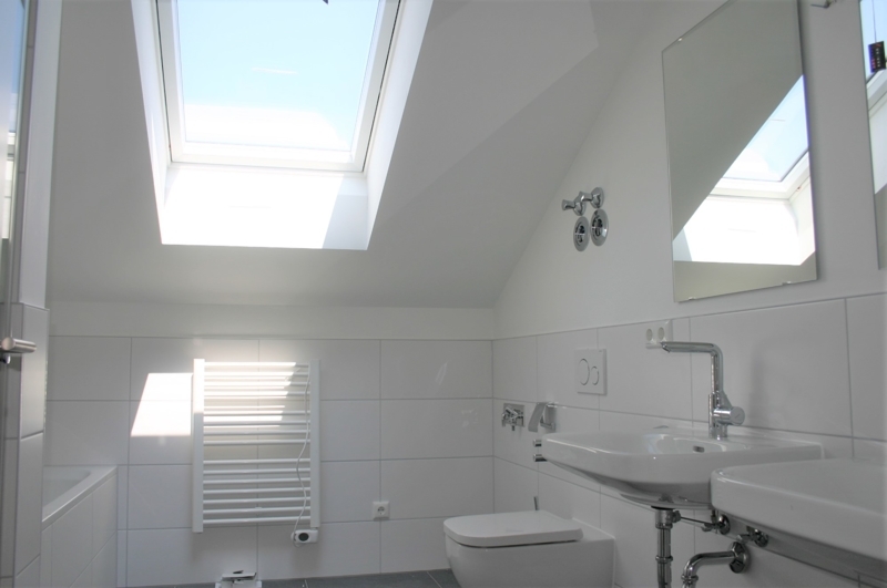 Alle Wohnräume sind mit edlem Parkett in Eiche massiv, geölt ausgestattet. In der Küche und im Bad wurden großformatige Bodenfliesen (Feinsteinzeug) verlegt. Diese sind in anthrazit gehalten und bringen im Bad einen tollen Kontrast zu den weißen Wandfliesen und Sanitärobjekten. Das moderne, luxuriöse Badezimmer hat ein Dachflächenfenster und ist dadurch schön hell. Es ist mit Doppelwaschbecken sowie Badewanne und großer, bodenebener Dusche ausgestattet. Auch ein Waschmaschinenanschluss ist vorhanden der alternativ zur Aufstellmöglichkeit im Waschkeller genutzt werden kann.