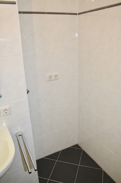 Die Wände in Badezimmer und separatem Gäste-WC wurden weiß gefliest (mit attraktiver Zierborte). Bad und Gäste-WC wurden jeweils mit einem Handtuchheizkörper ausgestattet. Das Badezimmer hat ein Fenster und verfügt über eine Badewanne. Das Gäste-WC bietet Stell- und Anschlussmöglichkeit für Waschmaschine und Trockner in einer dafür vorgesehenen Nische.