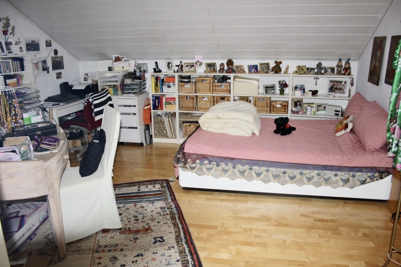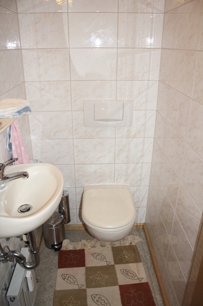Der Eingang zu der überaus großzügigen 2-Zimmer-Dachgeschosswohnung (Wohnfläche fast 87 m²!) liegt im 1. OG. Hier befindet sich ein praktischer Treppenvorraum, z.B. zur Unterbringung eines Schuhschranks. Auch das Gäste-WC ist im 1. OG.