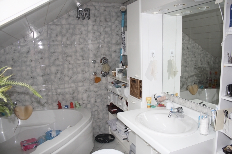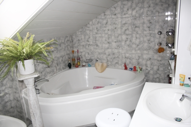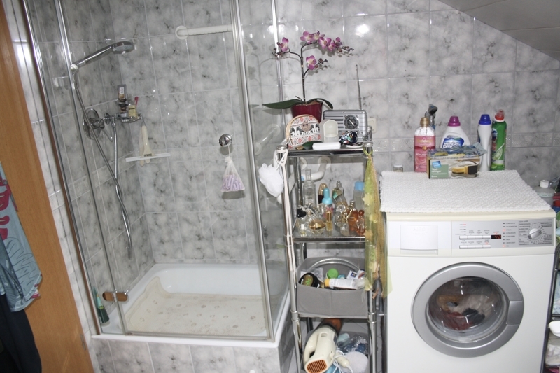 Das 10 m² große Tageslichtbad (mit zwei Dachfenstern) besticht durch die schöne Eckbadewanne. Eine Dusche mit Glastrennwand steht zusätzlich zur Verfügung. Ein Waschmaschinenanschluss und Platz für die Waschmaschine ist vorhanden.